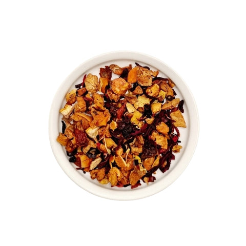 Apfelstücke, Hibiskusblüten, Hagebuttenschalen, Orangenschalen, Aroma, Holunderbeeren, Himbeeren(1,5%), Ringelblumenblüten, Vanillestücke(0,5%).